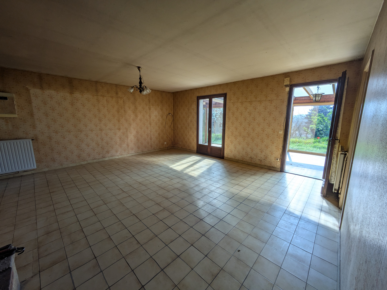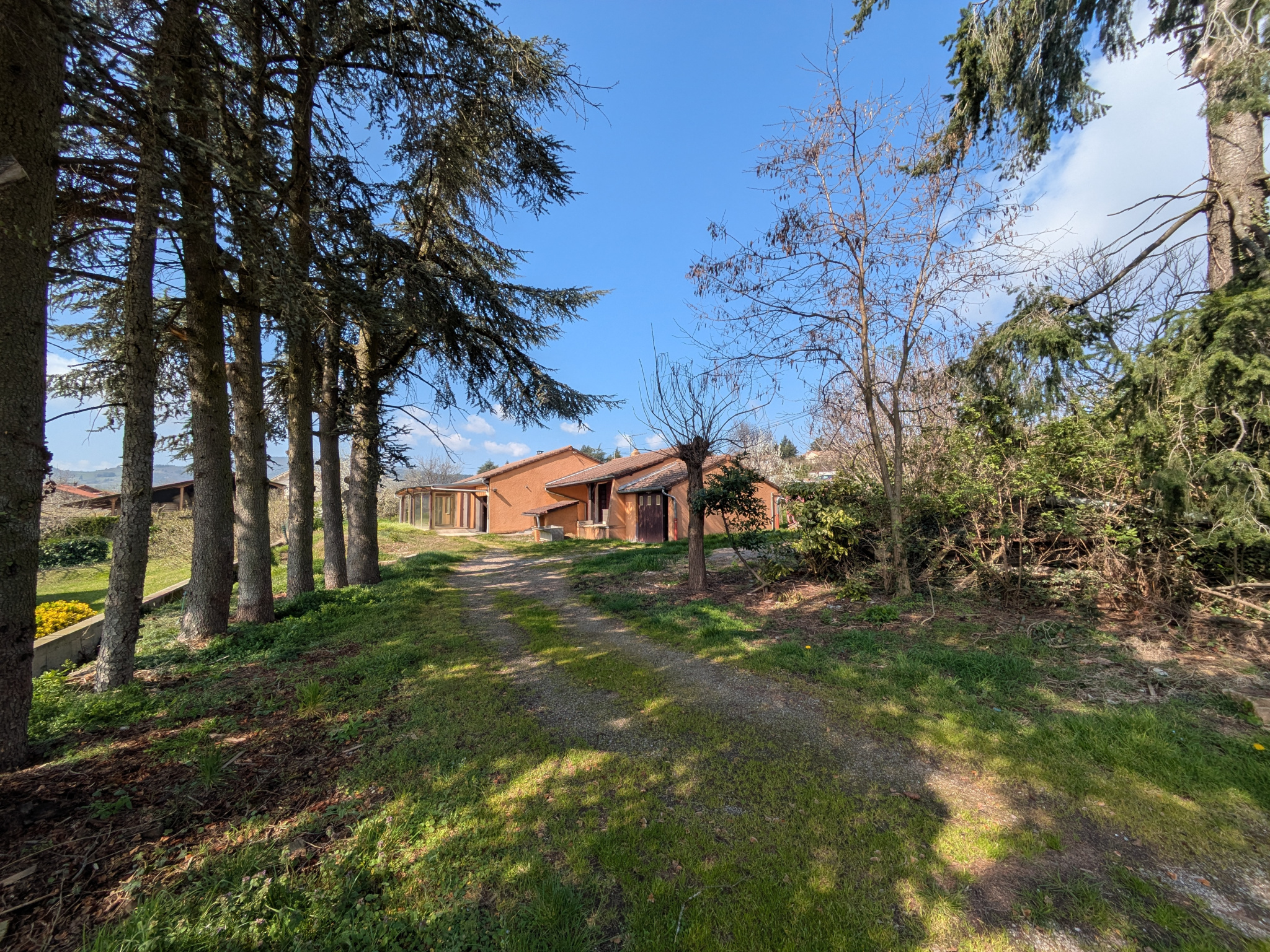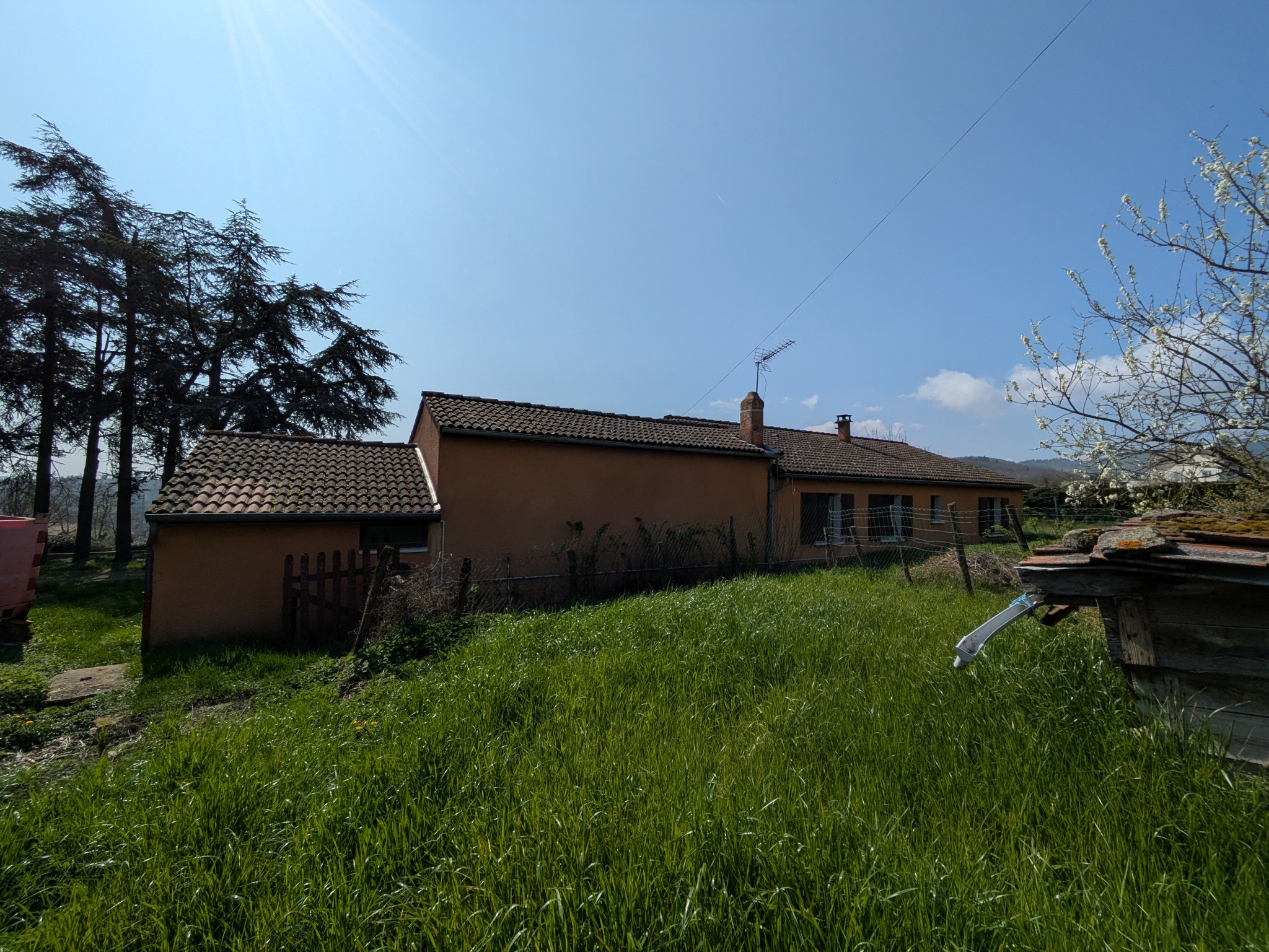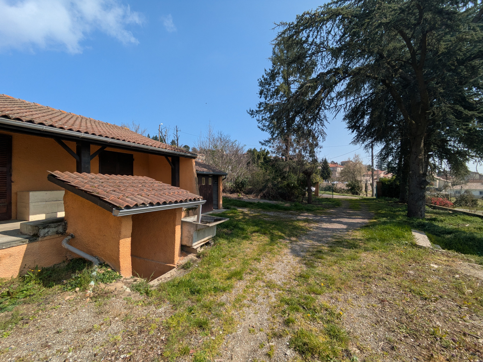 A l’extérieur, la parcelle est close. Le jardin est arboré. Notez la proximité avec la route qui traverse le village. Arrêt de bus juste devant la maison. Proximité immédiate des nombreux commerces de Boulieu (pharmacie, boucherie, boulangerie, Poste, Banque, Bar-tabac etc… ).