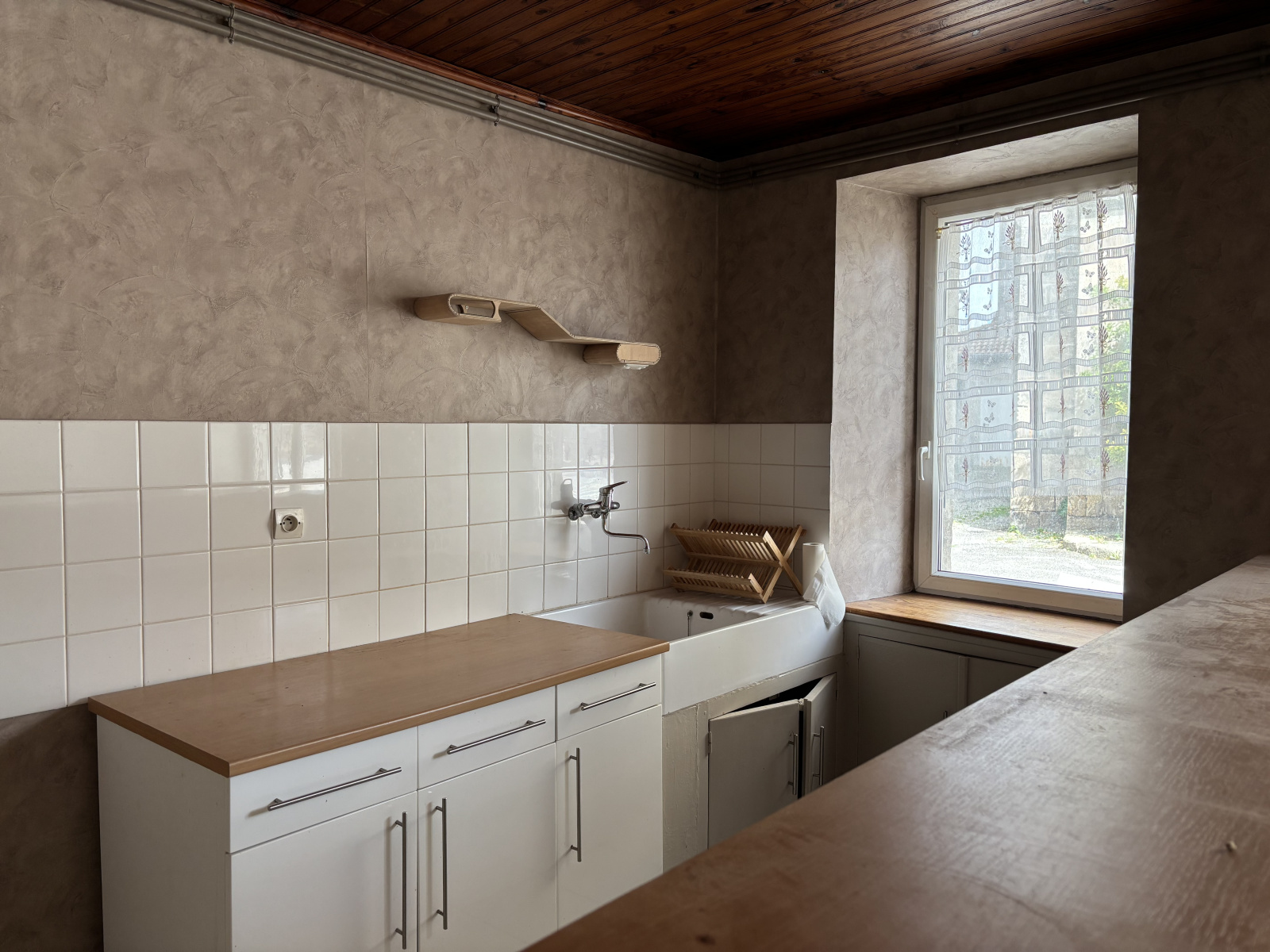 Elle se compose d'une entrée, une pièce de vie avec cuisine ouverte, wc et une cave au rez-de-chaussée. Au premier étage trois chambres et une salle d'eau. Enfin, au dernier étage une grande partie de combles aménageables.
