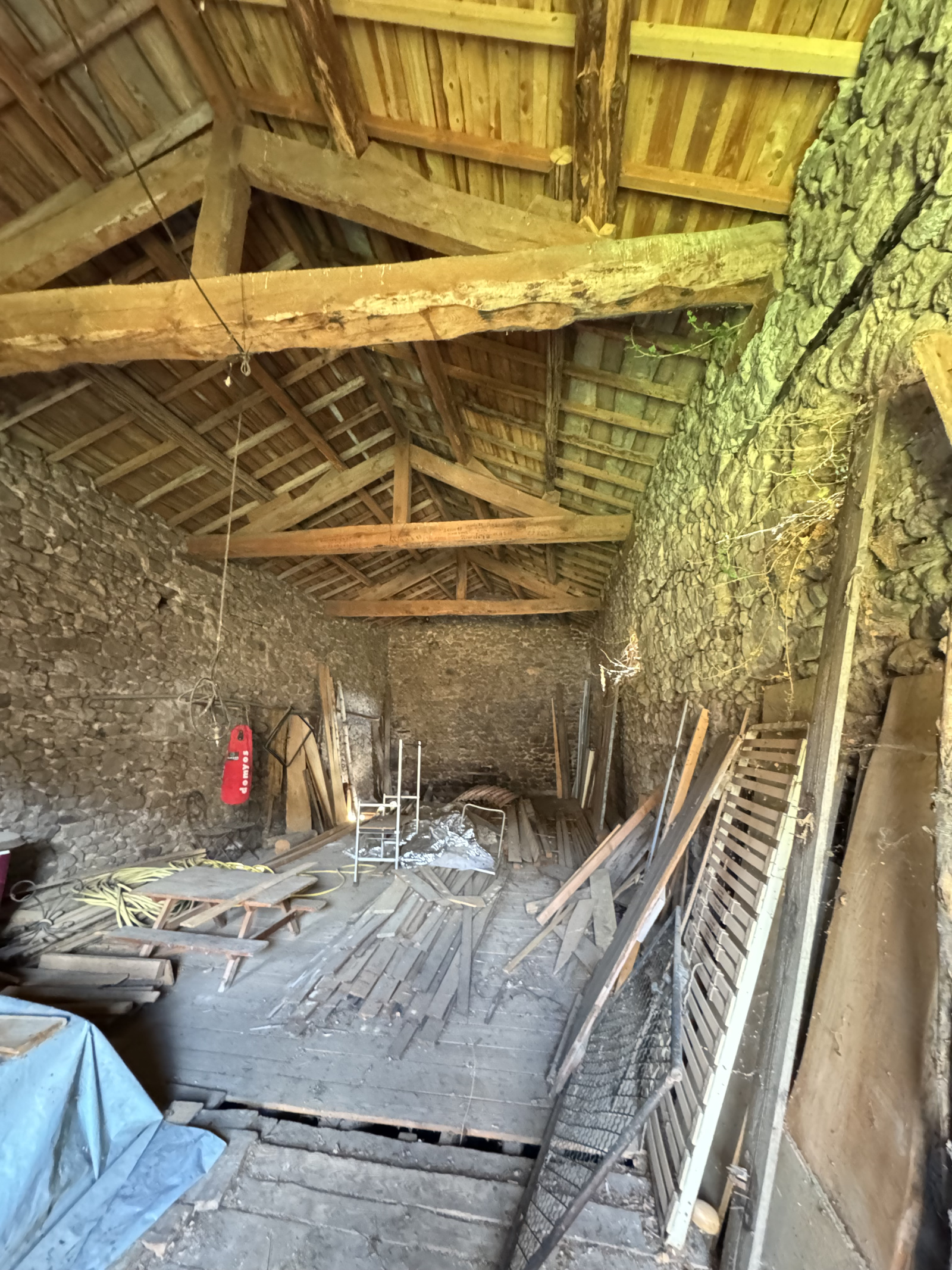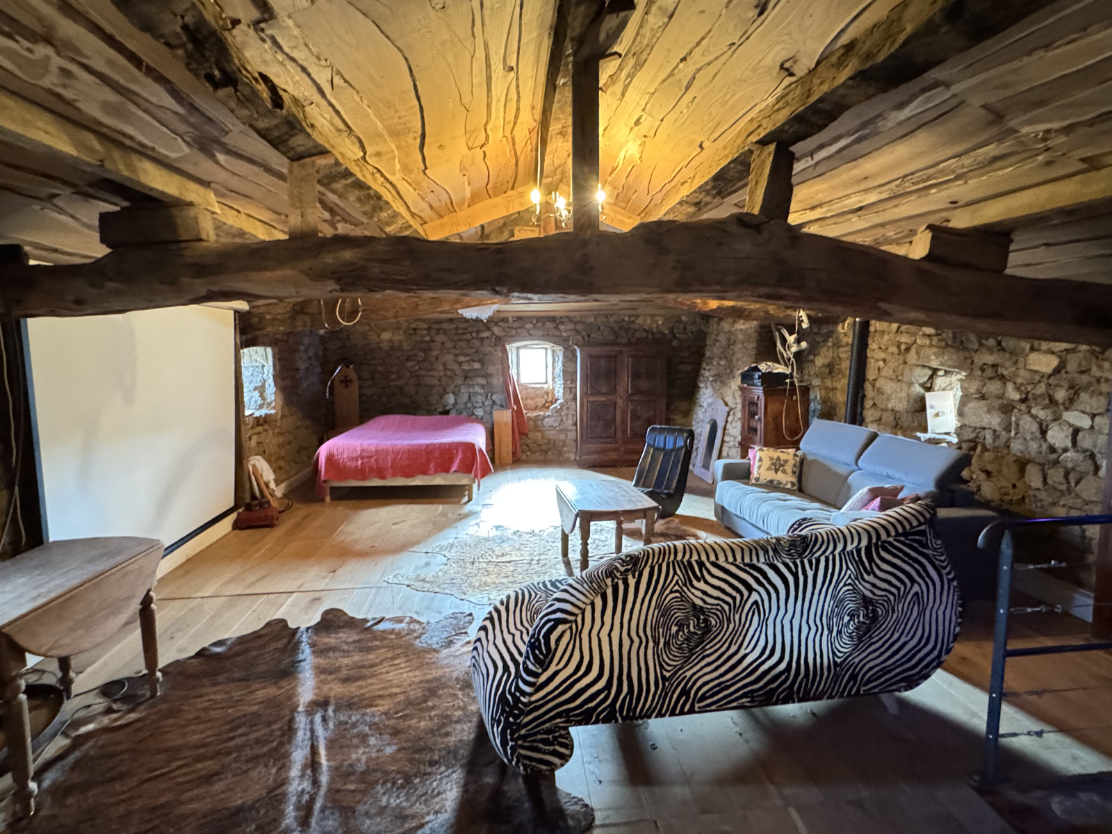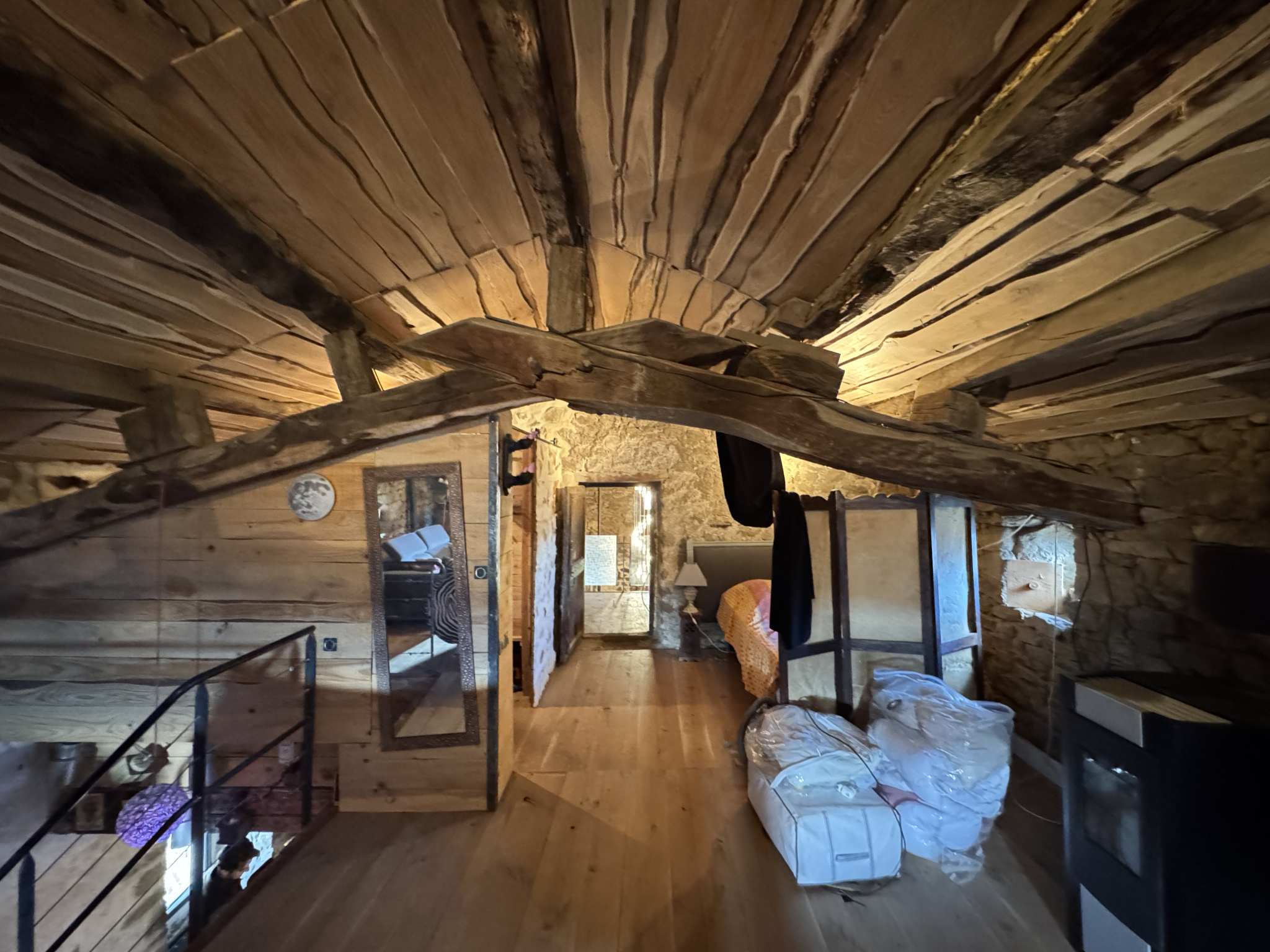 A l'étage, un grand dortoir mansardé et rustique de 66 m² au sol offre de multiples possibilités, salon tv ou bibliothéque, coins chambres. Cette pièce dispose d'un poêle à pellets. Une mezzanine domine le séjour et une petite chambre mansardée complète cet étage.