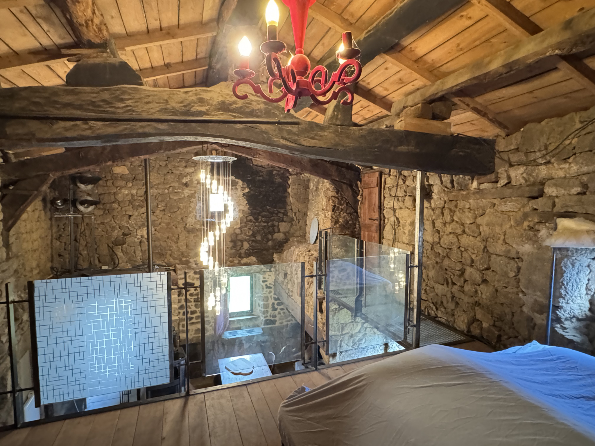 Une chambre est accessible depuis le séjour par un passage magique dans la cheminée. Un dégagement conduit ensuite vers une salle d'eau avec double cabine de douche-hammam et un wc, puis un grand salon de 35 m² avec cheminée et poêle à bois.