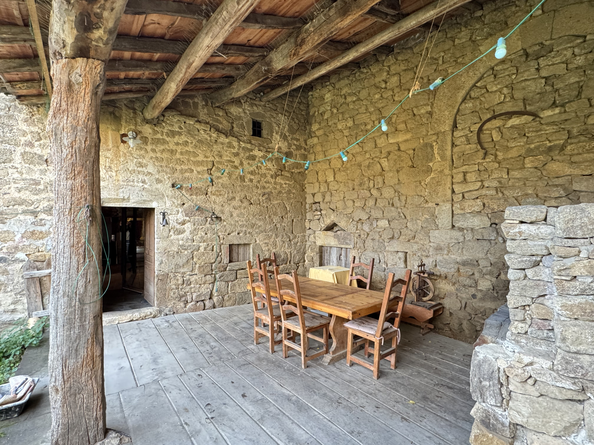 La maison est construite sur caves, et offre de plain-pied une belle surface habitable avec une salle à manger et cuisine équipée pour 38 m², agrémentée d'une cheminée ardéchoise et d'un poêle à pellets. Cette magnifique pièce bénéficie d'un plafond cathédrale.